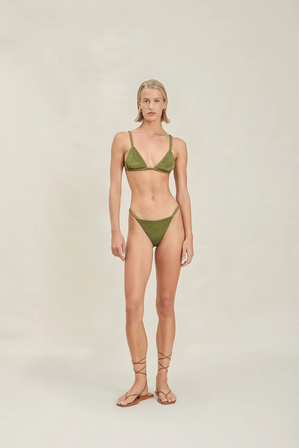 The Zuri Bikini in Shiny Green delivers bold style with a lustrous finish that catches the light beautifully. This two-piece swimsuit features a flattering cut designed for comfort and confidence at the beach or pool. The shiny fabric adds a modern, eye-catching element to your summer wardrobe. Perfect for making a statement while enjoying the water.